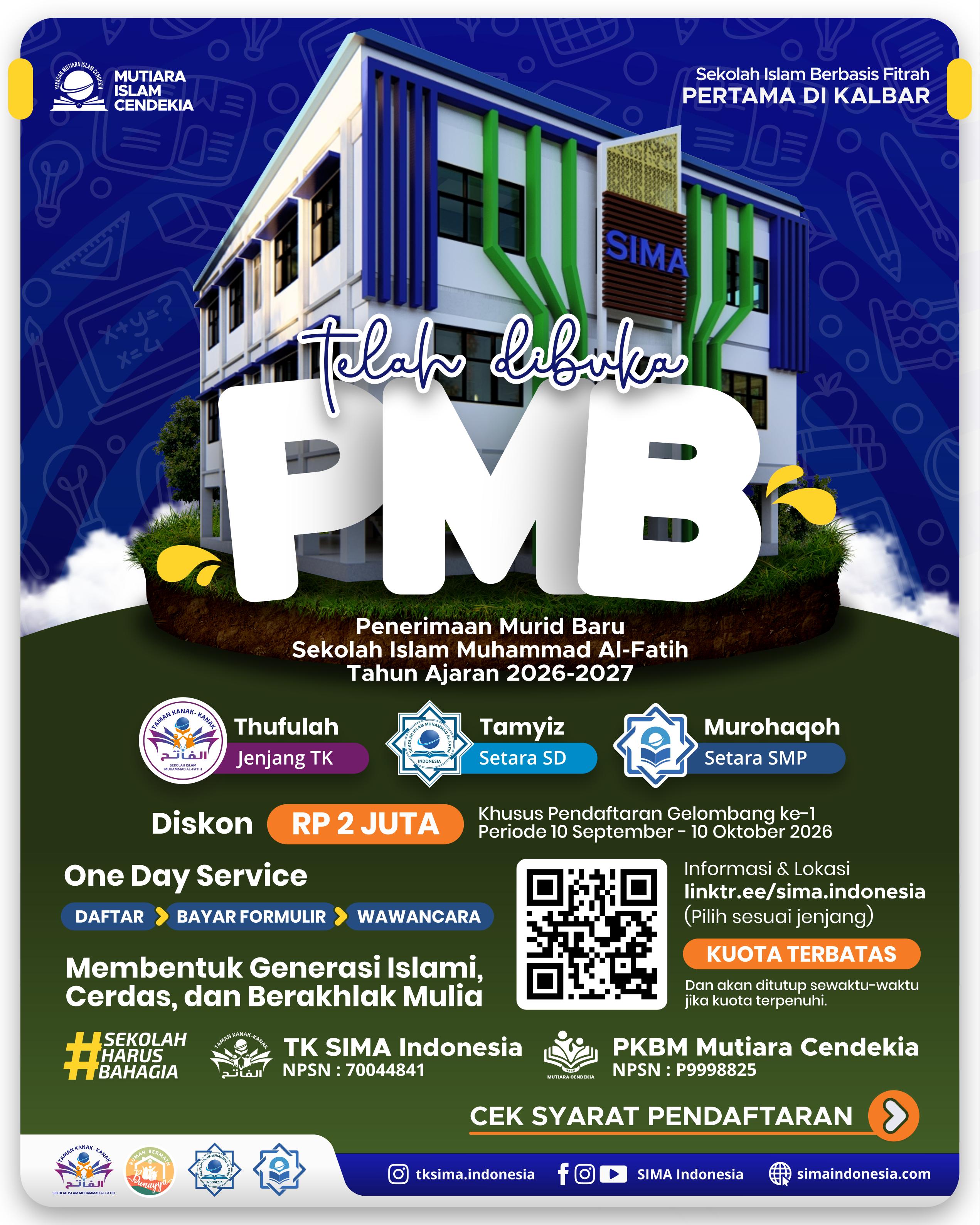 Kabar gembira untuk Ayah dan Bunda di Kalimantan Barat! Penerimaan Murid Baru (PMB) SIMA Indonesia (Sekolah Islam Mutiara Cendekia) kini resmi dibuka untuk Tahun Ajaran 2026/2027.